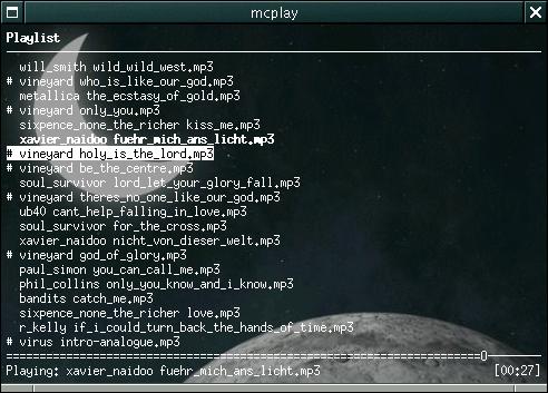 Mcplay is not just another fontend for mpg123. It is also just another frontend for many other players (ogg123, sox, drvmidi). It is able to adjust the soundmixer's volume and it is able to read and write playlist files (*.m3u). And it has support for infrared controls via lirc.